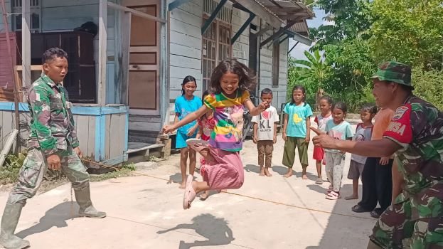 Nampak terlihat anggota satgas TMMD Sertu Hazirman dan Serda Miswanto dengan berpakaian PDL dan bertopi rimba tersebut bermain tali merdeka bahkan terlihat senyum keceriaan anak-anak tersebut tak terbendung.