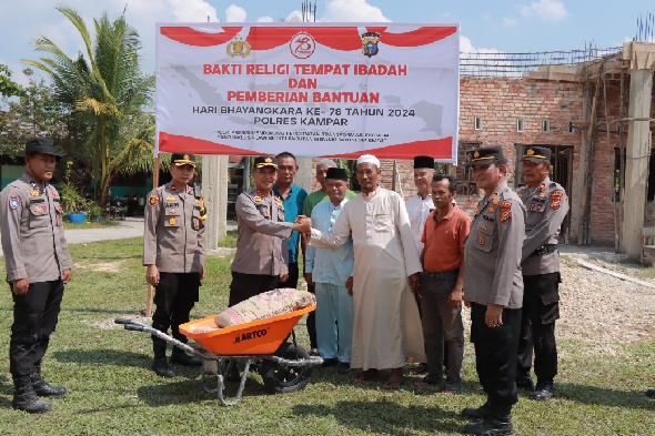 BNEWS - Menjelang peringatan Hari Bhayangkara ke-78 tahun 2024, jajaran Polres Kampar menggelar kegiatan bakti religi berapa pemberian bantuan material untuk pembangun Madrasah Ibtidaiyah Nurul Iman Desa Kampar, Jumat (14/6/2024).