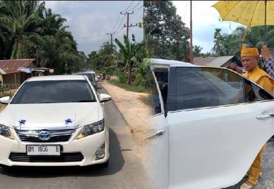 Mobil tersebut mengantar mempelai laki-laki dari Jalan Hang Tuah Desa Sungai Raya menuju Jalan Kuantan Timur Desa Sungai Beringin, tempat berlangsungnya acara pernikahan.