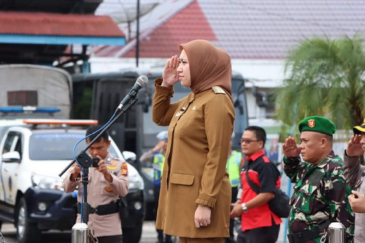 BNEWS - Bupati Indragiri Hulu (Inhu), Rezita Meylani Yopi, menghadiri sekaligus memimpin Apel Gelar Pasukan Ops Ketupat Lancang Kuning 2023, di Lapangan Mapolres Inhu, Senin (17/4/2023).